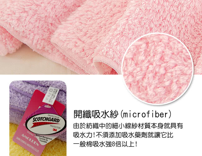 配合特殊材質讓每根纖維具有吸水性,如同奈米小分子的吸濕技術提高吸水效能達到擦拭後迅速吸乾的效果!除了質感柔軟,吸水力比一般毛巾強8倍。買一條可抵多條!